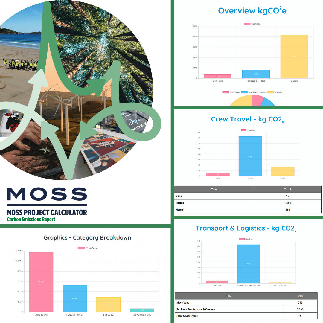Expressed in CO2e, Moss’ innovative and comprehensive tool calculates the impact of each material selected, its printing, installation and transportation. All data has been mapped to Moss UK’s material stock system and independently checked and verified by sustainability consultants, Green Circle Solutions. The background information provides deep dive analytics of each print material and substrate, creating meaningful comparison data to understand the true impact of each product solution.